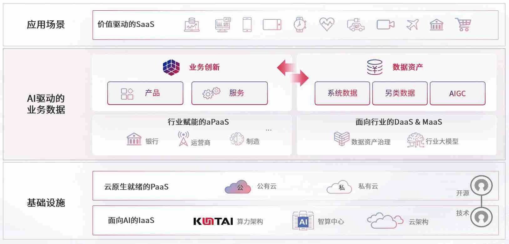 数字时代,,,,围绕企业数字化转型的关键要素,,,,新葡的京集团35222vip数码开创性的提出数云融合战略和技术体系框架,,,,着力在云原生、、、、数字原生、、AI原生和信创产业上架构产品和服务能力,,,为处在不同数字化转型阶段的快消零售、、、、汽车、、金融、、医疗、、、、政企、、教育、、运营商等行业客户提供泛在的敏捷IT能力和融合的数据驱动能力,,,构建跨界融合创新的数字业务场景和新业务模式,,,助力企业级客户建立面向未来的核心能力和竞争优势,,全面推动社会的数字化、、、、智能化转型升级。。。。