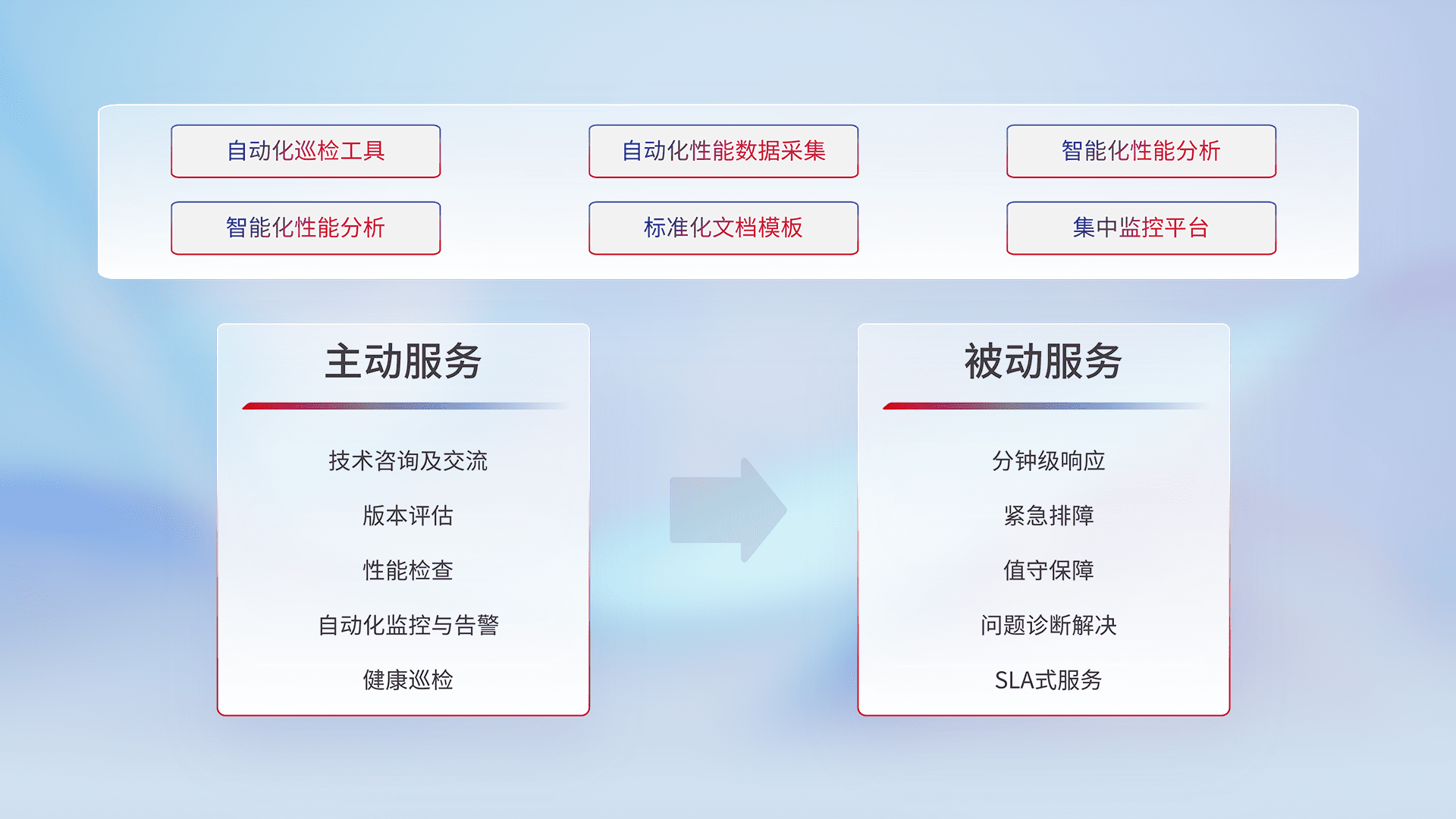 智能化工具和标准化文档,,保障服务质量,,,提供主动服务(包含技术咨询、、、版本评估、、性能检查、、、自动化监控与告警、、、、健康巡检)和被动服务包含(分钟级响应、、、、紧急排障、、、、值守保障、、、问题诊断解决、、、SLA服务)。。。